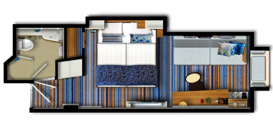 Vo všetkých kategóriách sa nachádza regulovateľná klimatizácia, safe, kúpeľňa so sprchou, sušič na vlasy, telefón, Tv s plochou obrazovkou, župany, papuče a kávovar Nespresso (v cene plavby sú aj 2 kapsule na kajutu denne).