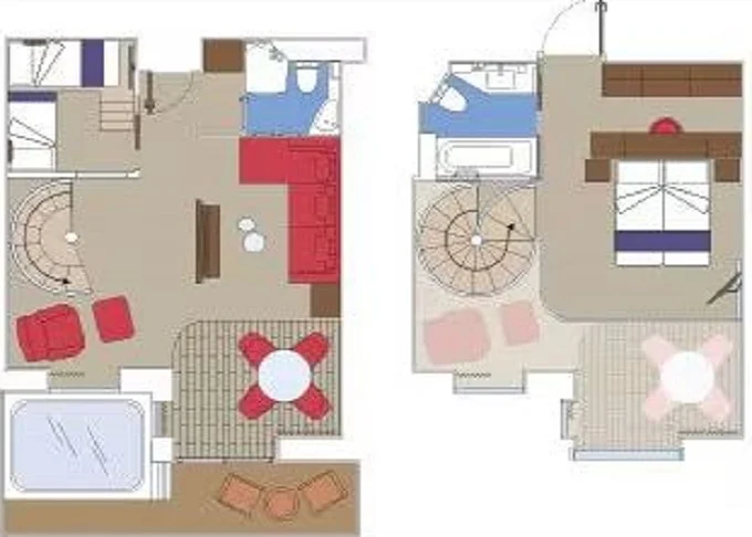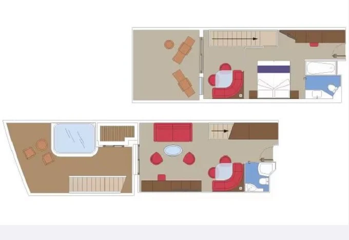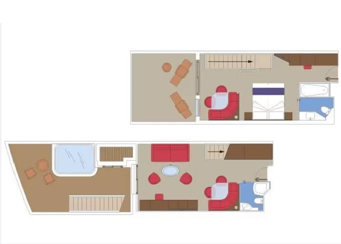 | YJD - Yacht Club Duplex Suite s vírivkou 46 m² + balkón 30 m². Vírivka. 2 podlažia, šatník, 2 kúpeľne (1 s vaňou). Max 4 osoby. 16. paluba. Cenový model MSC Yacht Club. | 9 862 € 4 931 € za osobu | ||