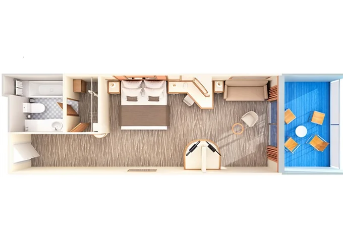 | 8B - Kajuta s balkónom 21,5 - 25,5 m² (vrátane balkóna). 10. paluba stred, vzadu; 11. paluba vpredu, vzadu. | 2 104 € 1 052 € za osobu | ||