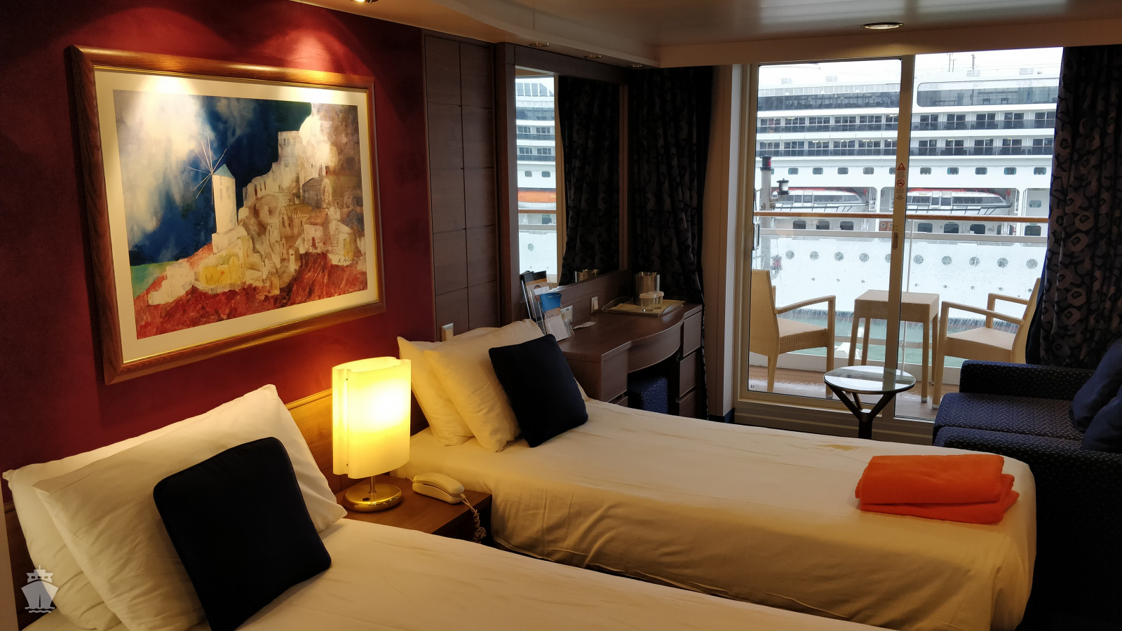 Suite s balkónom: cca 31m² kajuta s manželskou posteľou (na požiadanie 2 oddelené postele) a rozkladacia pohovka. Klimatizácia, kúpeľňa s vaňou, toaletný stolík, priestorná skriňa, interaktívna TV, telefón, minibar, sejf, sušič na vlasy. Balkón so stolíkom a stoličkami. Internetové pripojenie (za poplatok).