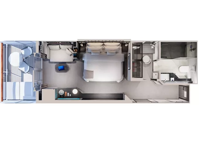 | Ocean Terrace Suite OT1 Suita 28 m² + kúpeľňa 4 m² + terasa 7 m². 6. paluba stred / 7. paluba vpredu, vzadu. Spálňa s obývacou časťou, šatník. Minibar, kávovar, vodná kanvica, ďalekohľad, sejf, kúpeľňa so sprchou. Fľaša šampanského na privítanie. Maximálna kapacita 2 dospelé osoby + 1 dieťa do nedovŕšených 18 rokov. | 11 620 € 5 810 € za osobu | ||