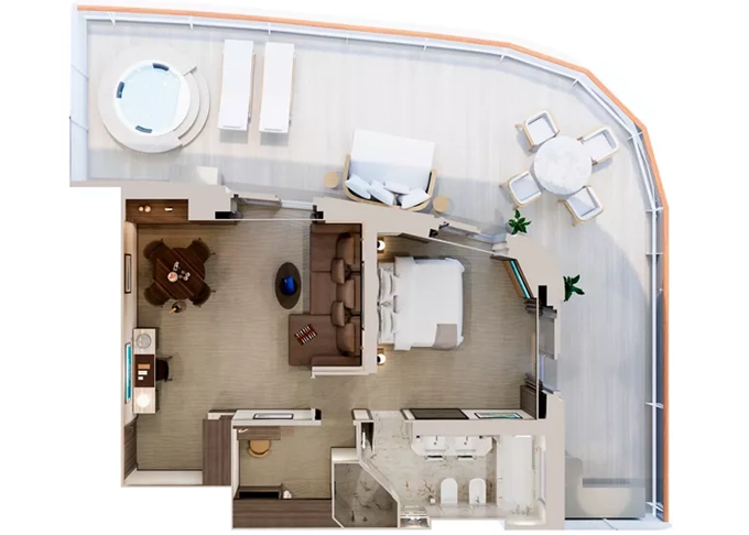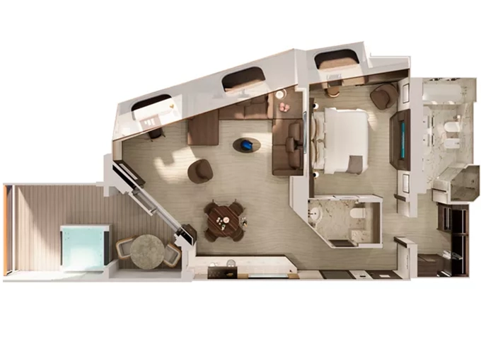 | Retreat Residence Suita 63 m² + Terasa s vírivkou a sedením 14 m² / 7. paluba: 18 m². Spálňa s obývacou a jedálenskou časťou, šatník. Koktailová súprava, minibar, kávovar, vodná kanvica, ďalekohľad, sejf, mramorová kúpeľňa s vaňou a sprchou, extra wc. Taška Technogym Case Kit. Fľaša šampanského na privítanie. Služby osobného majordóma. Maximálna kapacita 3 dospelí alebo 2 dospelí + 2 deti pod 18 rokov. | 45 780 € 11 445 € za osobu | ||