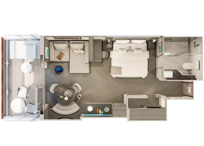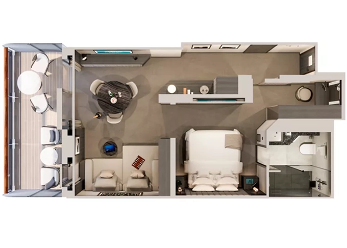 | Retreat Residence Suita 63 m² + Terasa s vírivkou a sedením 14 m² / 7. paluba: 18 m². Spálňa s obývacou a jedálenskou časťou, šatník. Koktailová súprava, minibar, kávovar, vodná kanvica, ďalekohľad, sejf, mramorová kúpeľňa s vaňou a sprchou, extra wc. Taška Technogym Case Kit. Fľaša šampanského na privítanie. Služby osobného majordóma. Maximálna kapacita 3 dospelí alebo 2 dospelí + 2 deti pod 18 rokov. | 32 700 € 10 900 € za osobu | ||