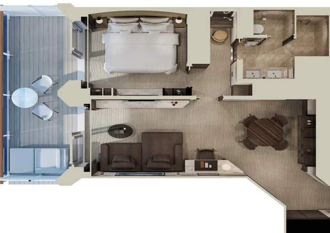 | Ocean Terrace Suite OT1 Suita 28 m² + kúpeľňa 4 m² + terasa 7 m². 6. paluba stred / 7. paluba vpredu, vzadu. Spálňa s obývacou časťou, šatník. Minibar, kávovar, vodná kanvica, ďalekohľad, sejf, kúpeľňa so sprchou. Fľaša šampanského na privítanie. Maximálna kapacita 2 dospelé osoby + 1 dieťa do nedovŕšených 18 rokov. | 7 265 € 7 265 € za osobu | ||