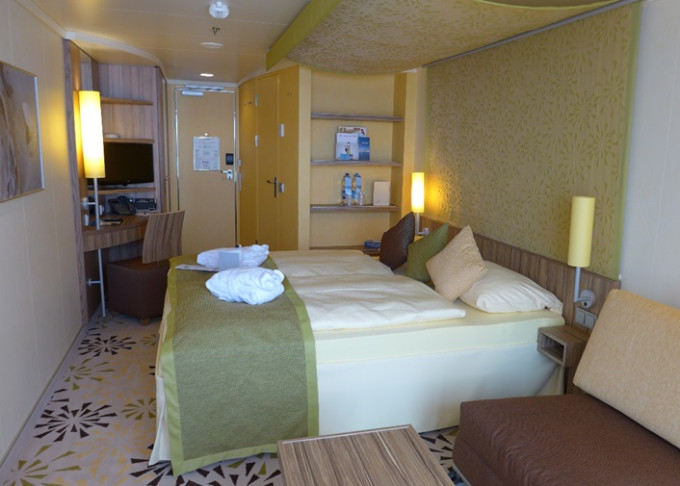 CA - Vonkajšia kajuta PREMIUM / obmedzený výhľad od 14 m². Neotvárateľné okno / obmedzený výhľad. 6. paluba. Max 4 osoby. Cenový model Premium. 1 790 € 895 € za osobu